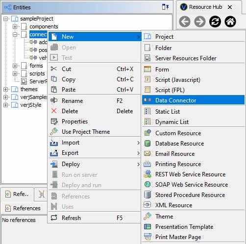 Data Connectors are created by selecting File > New > Data Connector from the main menu or right clicking the Entity Tree and selecting New > Data Connector.