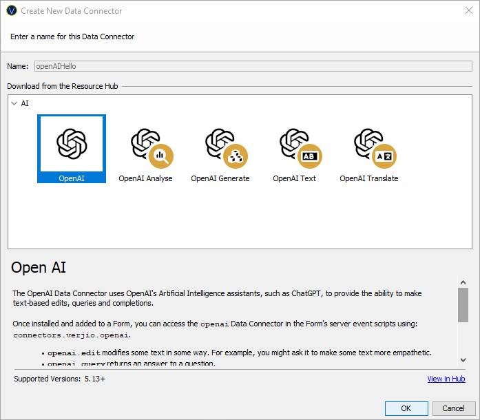 Download from the Resource Hub: Select one of the ready made Verj.io Data Connectors. By selecting a Data Connector, a preview of the Connector will be shown below the selection panel with a description that describes the Data Connector and its implementation. The preview also show the Verj.io server Supported Versions.