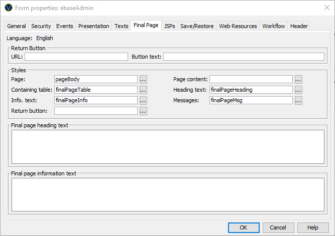 This allows you to set attributes for the form’s final page This is a legacy feature of the Ebase system and is not commonly used with new applications - this special page is displayed when the user clicks the special Finish button and form processing has ended (click here for further details).
