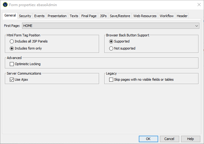 ·         Includes form only - the <form> tag includes just the Ebase form and not any included JSP or HTML panels. Use this option if you need to include your own <form> tags in included JSP or HTML files.