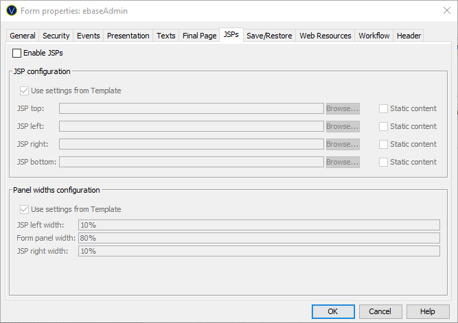 This tab allows you to specify the paths of the optional surrounding JSPs. JSPs specified here override any default values configured for form default properties in the form’s presentation template, and can themselves be overridden by specifying values for the Page Control properties for individual pages. Click here for info on the precedence of the various JSP configuration parameters.