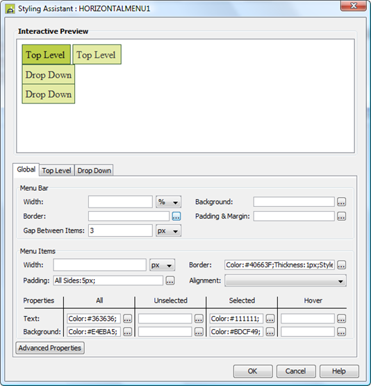 Menu Bar: these properties apply to the entire menu bar. Note that drop down menu levels are displayed outside of this container.