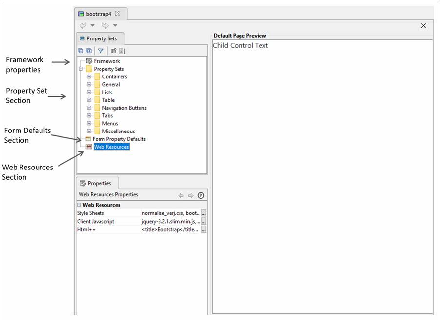 Allows specification of the styling framework used by this template or “None” to indicate no framework. Changing this property may result in changes to the generated HTML and CSS to suit the styling framework or in changes to the list of available controls and changes to some control properties – additional features may be displayed to suit the framework. “None” means that the default HTML and CSS is generated and the default list of controls is displayed.