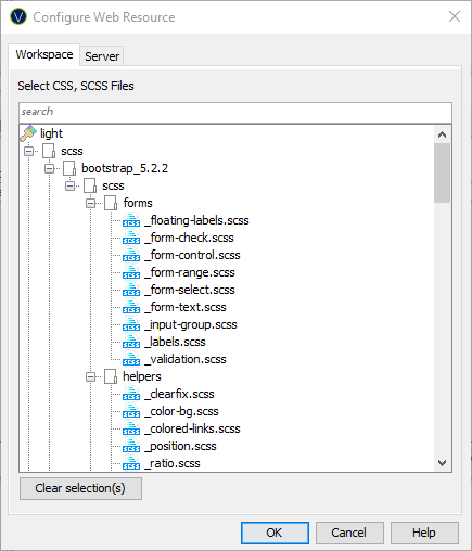When selecting workspace files using the file selection dialog, only the Web Resources contained inside the Theme’s folder structure are visible for selection.