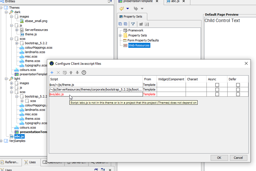 This section supports the association of client browser Javascript with the Presentation Template. Both internal Javascript files (existing within the workspace) and external Javascript files (loaded via URL) can be added. These Javascript files are automatically associated with all pages of all forms that link to the Presentation Template unless explicitly overridden by an individual form or page. The list of currently configured Javascript files can be seen in the Property Area and the ... button can be used to open the Client Javascript Configuration Dialog to add or remove Javascript files from the Presentation Template.