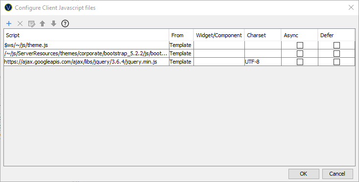 Client Javascript files are included in a page using <script> tags. These are generated in the order the Client Javascript files appear in this dialog (unless overridden or disabled by individual forms or pages). The order of Client Javascript files is important as code and functions in one script can only be used by Client Javascript files added after that script.