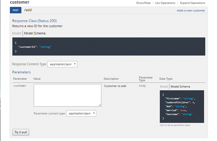 shows an endpoint configured as a HTTP POST that accepts a customer JSON object