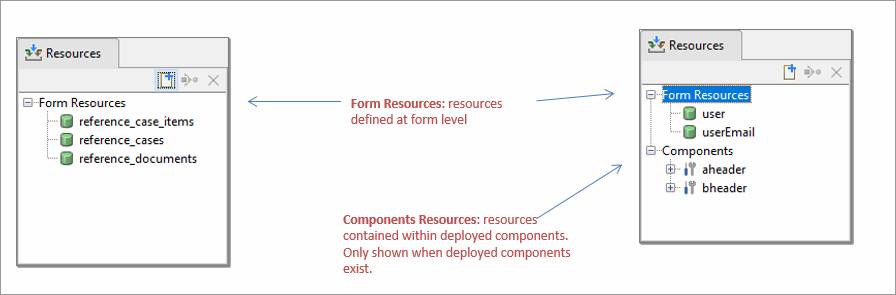 The Resources View contains a list of resources available to the parent form/component/integration service or workflow process. A resource must be added to this view before the resource fields can be mapped or the resource is referred to in a scripting statement. Resources contained within deployed components are only shown if deployed components exist and are then shown under the prefix name for each deployed component.