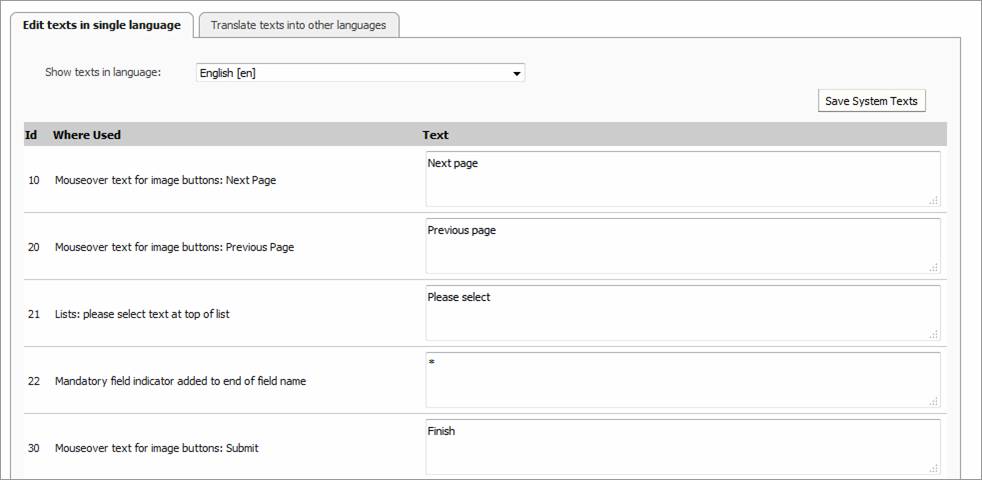 To edit texts in a single language, select the language from the dropdown, change the text, then click Save System Texts. The Where Used column describes the circumstances where the text is displayed.