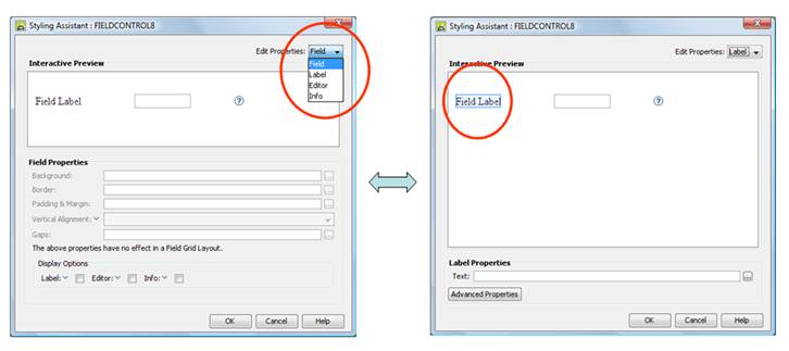 Note that not all sections can always be selected by clicking in the interactive preview e.g. for a Field Control (shown above), once you have selected the Field Label section, you can only return to the Field section by using the dropdown list.